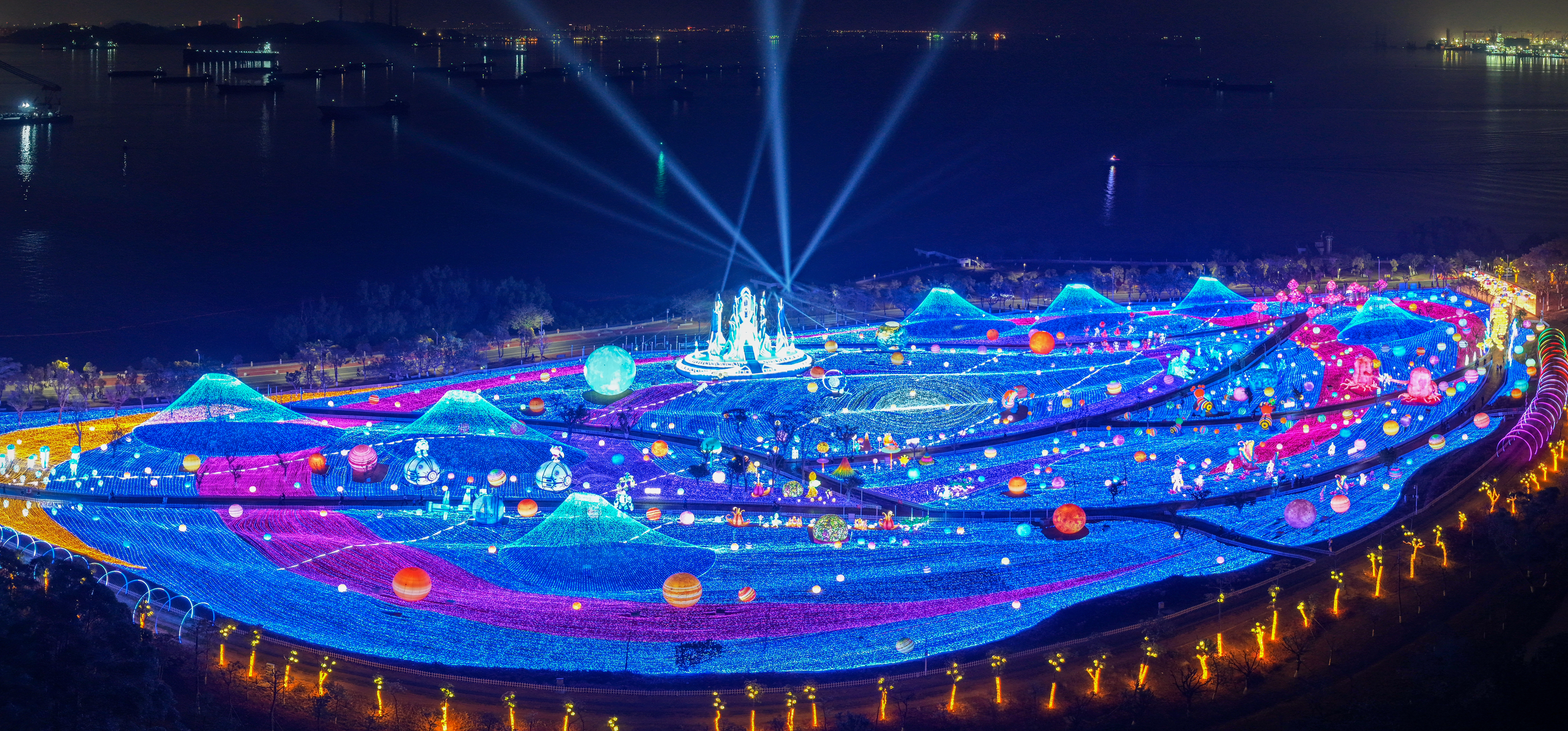利用南沙的滨海地理优势,设置海上观灯分会场,观众可从新建的天后码头出发,乘坐游船沿着珠江航行,在波光粼粼的江面上欣赏沿岸绚丽的灯组与主会场的精彩表演。