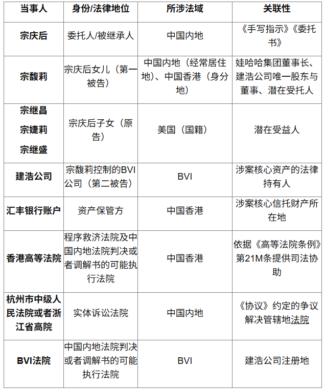 本案所涉诉讼法律关系错综复杂。从本案涉及的当事人与法律关系人来看,本案的原告宗继昌、宗婕莉、宗继盛为美国籍。被告宗馥莉女士具有中国香港居民身份,被告(在杭州中院被列为“第三人”) 建浩创投有限公司(以下称“建浩公司”)则根据BVI的法律注册成立。“Handwritten Instructions”(《手写指示》)、“Letter of Entrustment”(《委托书》)的当事人宗庆后先生生前是中国内地居民,与本案相关的宗庆后先生的“遗嘱”所涉利益相关人除宗馥莉女士外,均属中国内地居民。本案用于设立信托的离岸公司位于BVI,信托核心资产位于香港,信托受益人位于境外,信托意向文件、遗嘱以及当事人经常居住地均在中国内地。可以说,宗氏家族财富传承争议在中国内地非常具有典型性,其继承人不仅具有婚生子女、也有非婚生子女,而且具有多国籍身份;需要继承或者进行传承安排的财产既有位于国内、也有位于国外的;其财富传承的法律架构安排涉及多国的法律。这一案件集中反映了中国内地现代家族信托规划中的典型关键要素,其法律争议的裁判结果及争议解决路径,对于全球化背景下的中国企业家家庭的财富管理与传承架构安排具有深远的启示意义。