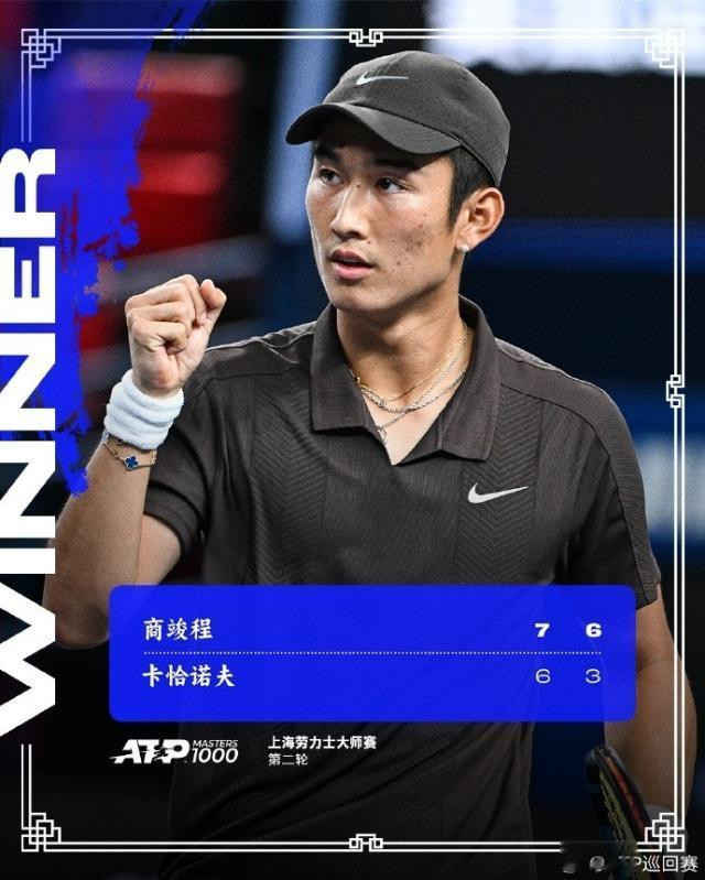 上海大师赛第二轮,商竣程2比0击败ATPTOP10选手卡恰诺夫,晋级32强。中国男选手击败TOP10胜场数: