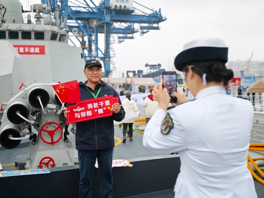 舷梯前,身着洁白军装的海军战士整齐列队,引导市民上舰参观;舰艇上,市民在舰员的带领下,了解武器装备、海上生活;码头上,海军特色科目互动旗语演示、航海绳结教学、战伤救护教学、枪械及防护装备展示等活动,也成了热门打卡点。