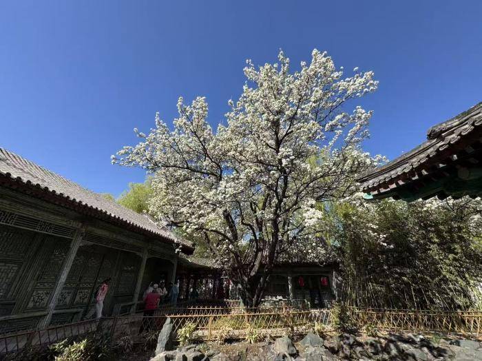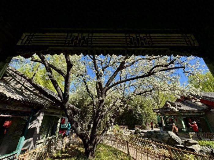 近日,北京大观园潇湘馆内梨花迎来盛花期,洁白素雅的梨花缀满枝头,与翠竹、古典建筑相映成趣,再现《红楼梦》中清雅诗意的春日景致。
